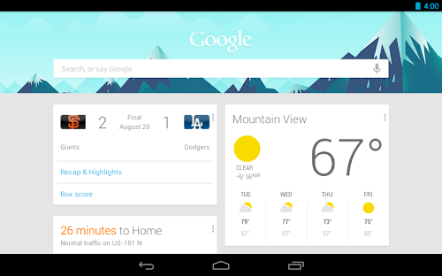 Plus: *Google Now* gets you just the right information at just the right time. It tells you todays weather before you start your day, how much traffic to expect before you leave for work, and more (Google Now is currently available on Android 4.1, Jelly Bean).